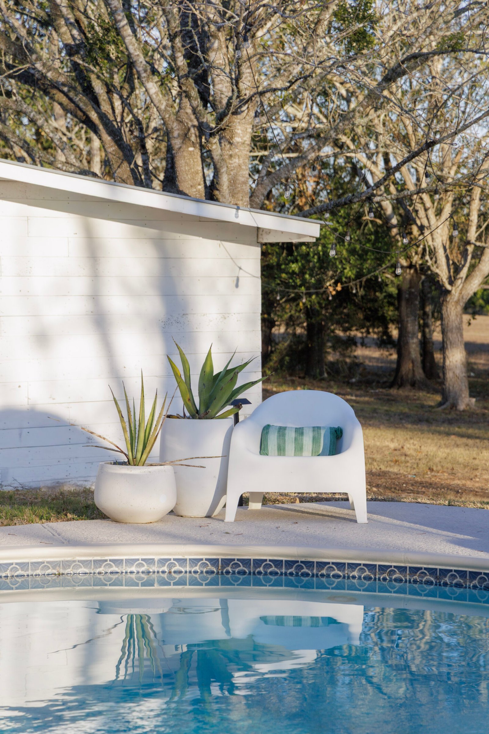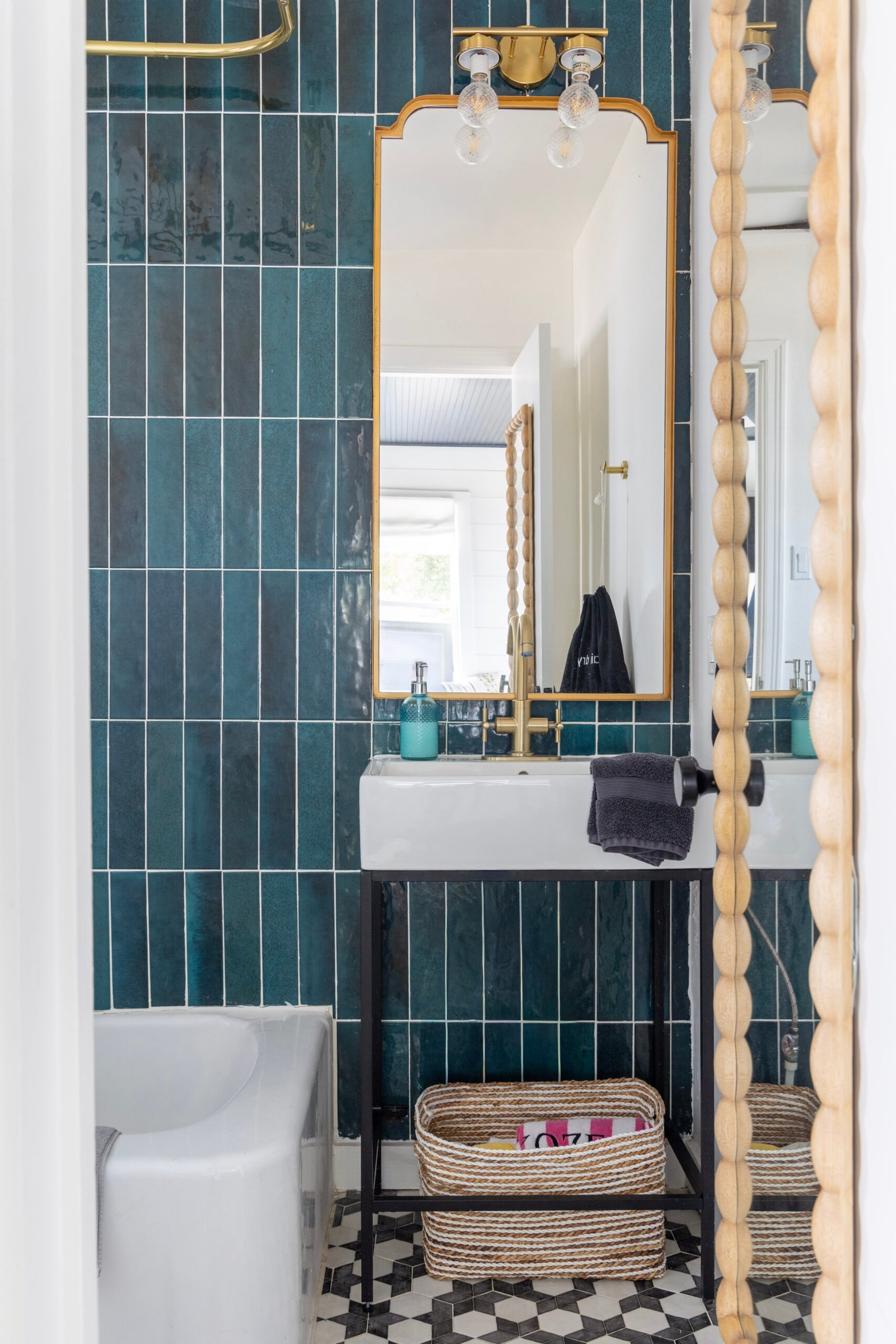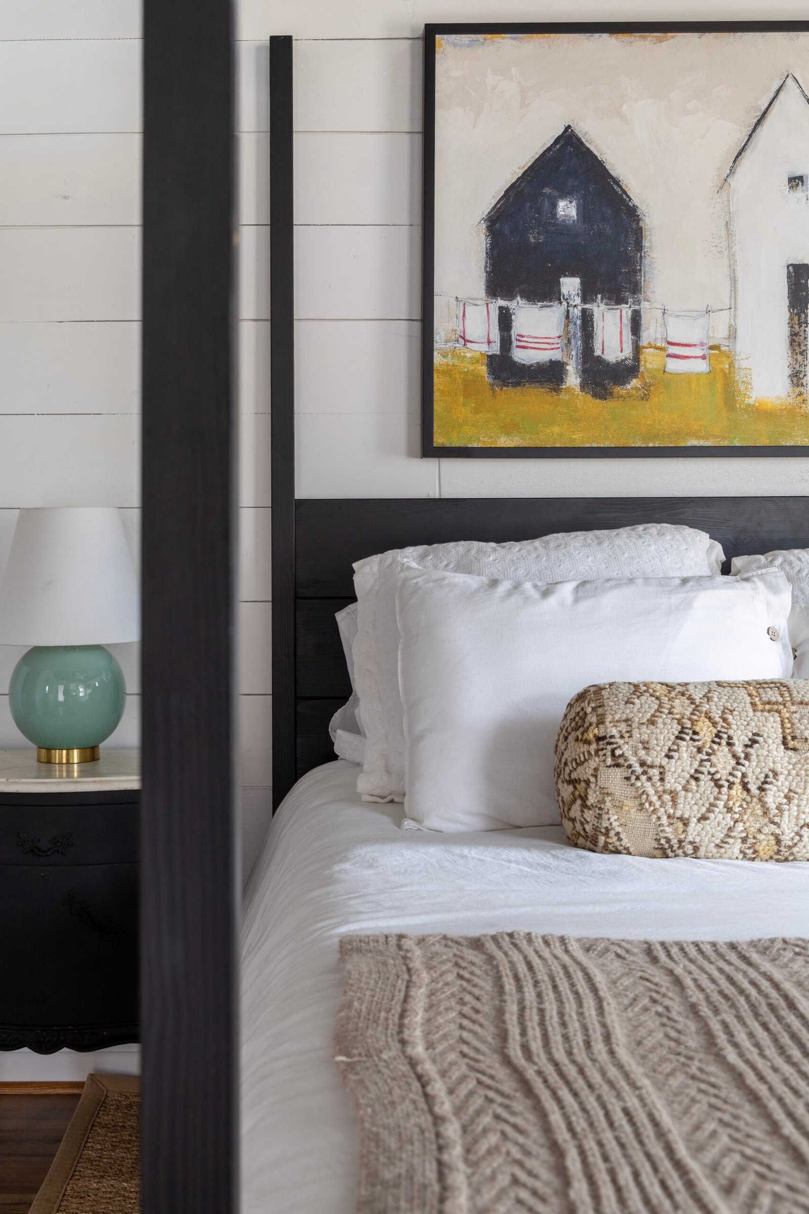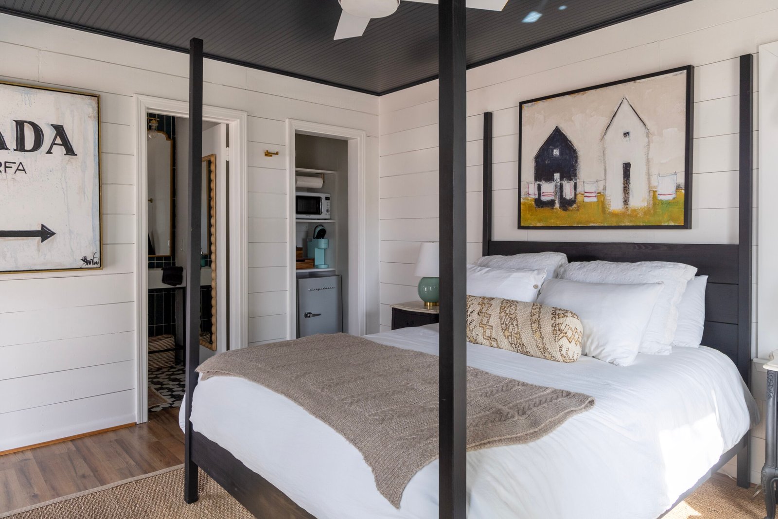 At about 240 square feet, bungalow 2 is Hotel Bebe’s most petite stay. Perfect for 2, the intimate space is filled with detail – a luxurious 4 poster queen bed, 2 upholstered vintage glam chairs and dresser. It features shiplap detail and a gorgeous Zellige tile bathroom. This bungalow has beautiful views of the cattle ranch next door where you can see the cows at dawn and dusk.